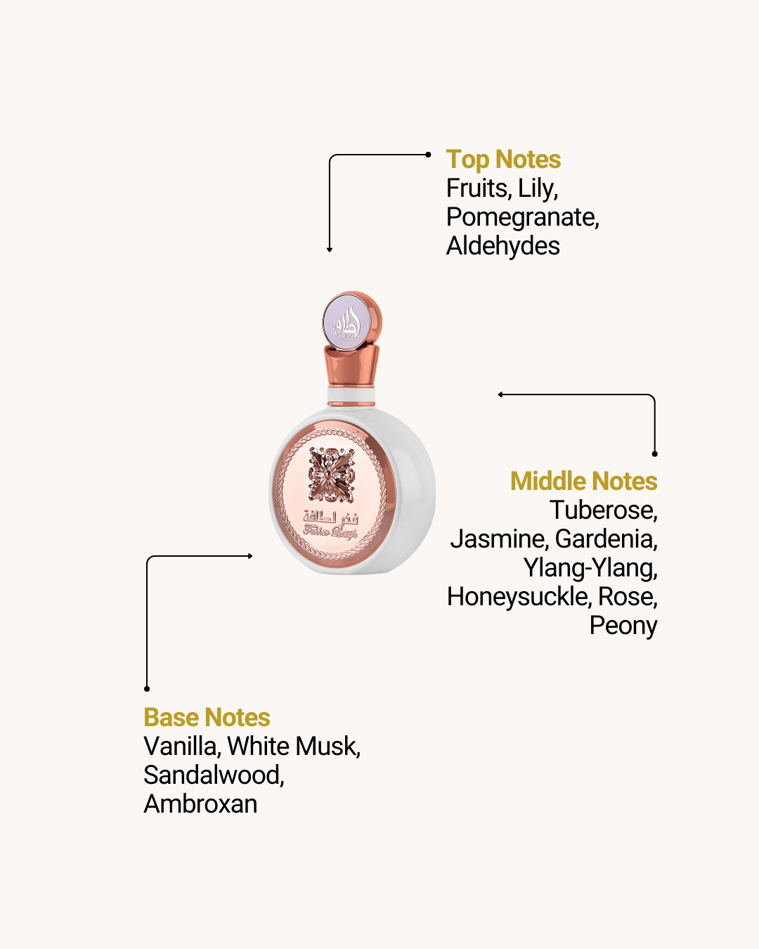 A bright, feminine floral gourmand that feels like a celebration. Fakhar for Women opens with sparkling fruits, aldehydes, lily, and juicy pomegranate. The heart blooms with rose, jasmine, tuberose, peony, gardenia, and honeysuckle for a lush floral cloud. Vanilla, sandalwood, ambroxan, and white musk create a soft, creamy trail that lingers beautifully on skin. Playful yet elegant—perfect for everyday wear or dressed-up evenings.