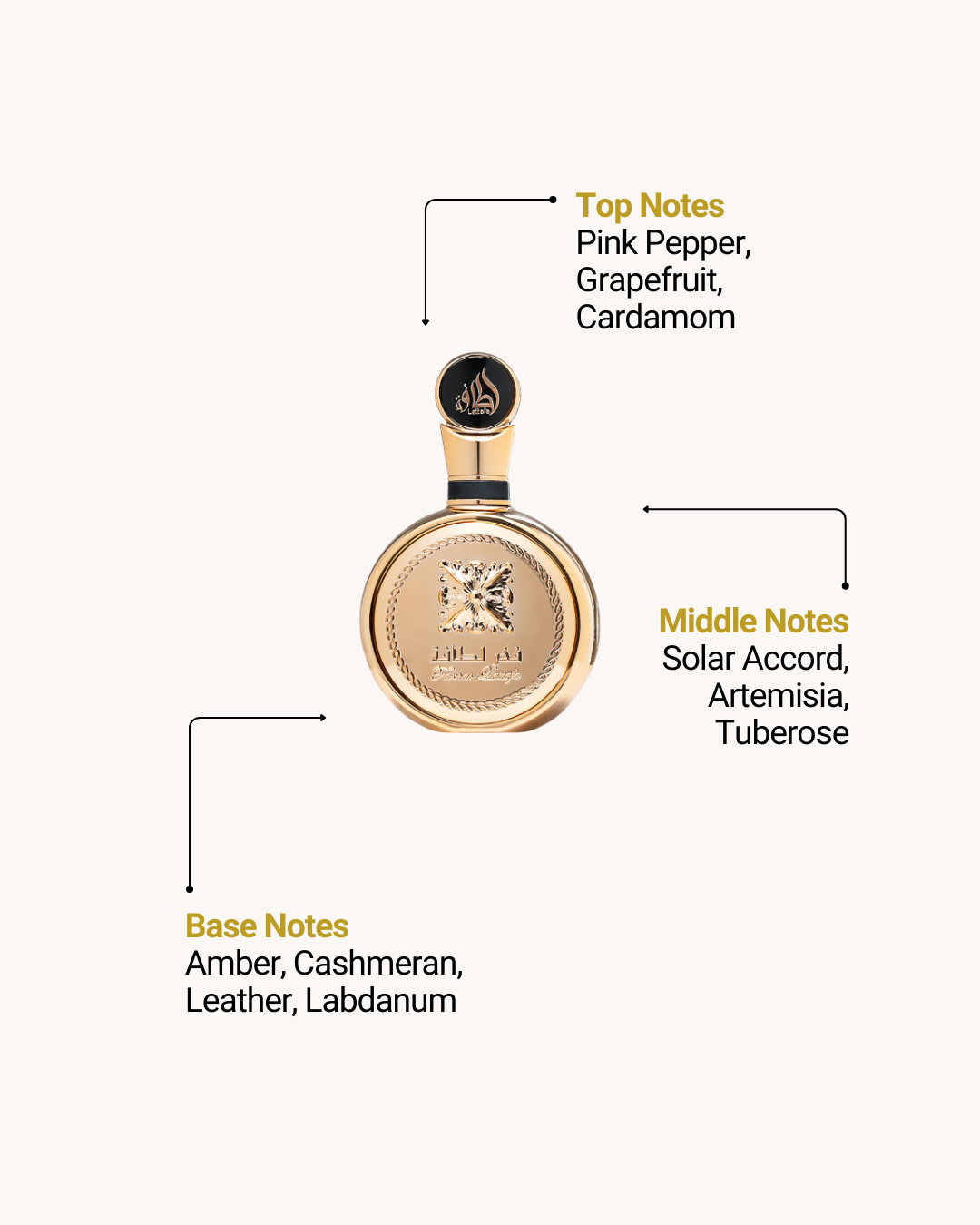 Fakhar Extrait is a modern, powerful scent designed to stand out. A vibrant opening of grapefruit, pink pepper, and cardamom gives a fresh yet spicy kick. The heart blends tuberose, solar notes, and artemisia for a warm, luminous character. In the base, cashmeran, amber, labdanum, and leather create a rich, sensual dry-down. Bold, confident, and long-lasting—ideal for nights out and special events.